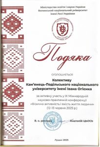 Окрім цього колектив Кам’янець-Подільського національного університету імені Івана Огієнка був нагороджений Подякою за активну участь у ІХ Міжнародній науково-практичній конференції «Фізична активність і якість життя людини», яку вручив ректор ВНУ імені Лесі Українки Анатолій ЦОСЬ.